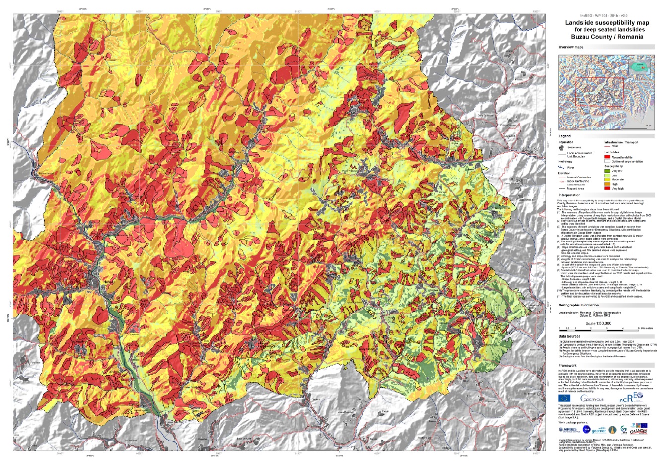 The favourable conditions of life, namely accessible relief, mild climate, the presence of salt deposits, the mountain-plain contact propitious to intense trade relations, has long allowed and encouraged the development of human activities. Presently, the average population density of 90 inhabitants/km2 raises to 150 inhabitants/km2 along the main valleys (Buzău, Slănic, Râmnic). The direct result of population increase has been land degradation by overloading the slopes, changing the drainage pattern, overgrazing – actions encouraged by changes in land administration and ownership, especially after 1989.Being one of the most populated regions of Romania, with a developed network of villages spread along a dense river system, the region is at the same time one of the areas most affected by multiple hazards, among which landslides, floods and earthquakes are the most important ones. The presence of numerous elements at risk (villages, isolated households and a dense road network) requires appropriate hazard assessment and mapping for risk management and governance.